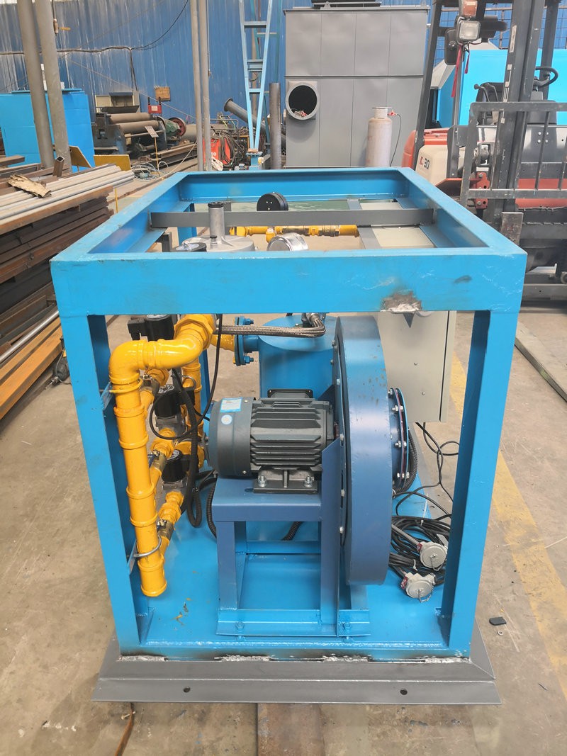 中間包烘烤器:包括燃燒器、鼓風(fēng)機(jī)、助燃風(fēng)管道系統(tǒng)和煤氣管道系統(tǒng),所述助燃風(fēng)管道系統(tǒng)一端連接鼓風(fēng)機(jī),另一端接入位于燃燒器前的煤氣管道系統(tǒng),還包括通過(guò)控制煤氣管道閥門開(kāi)閉自動(dòng)調(diào)節(jié)溫度的控制系統(tǒng),所述燃燒器為1-5個(gè)(根據(jù)膜胎尺寸確定),中間包工作層受熱均勻,易脫模節(jié)能效果明顯。